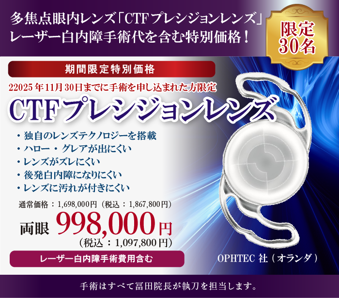 当院は、日本で初めて「3焦点プレミアムICL」による老眼治療を導入して、多くの治療実績を有しています。また、冨田院長は日本人の眼科医として、「3焦点プレミアムICL」による老眼に対するICL手術を初めて成功させた実績があり、日本で唯一の上級指導医ライセンスを与えられています。